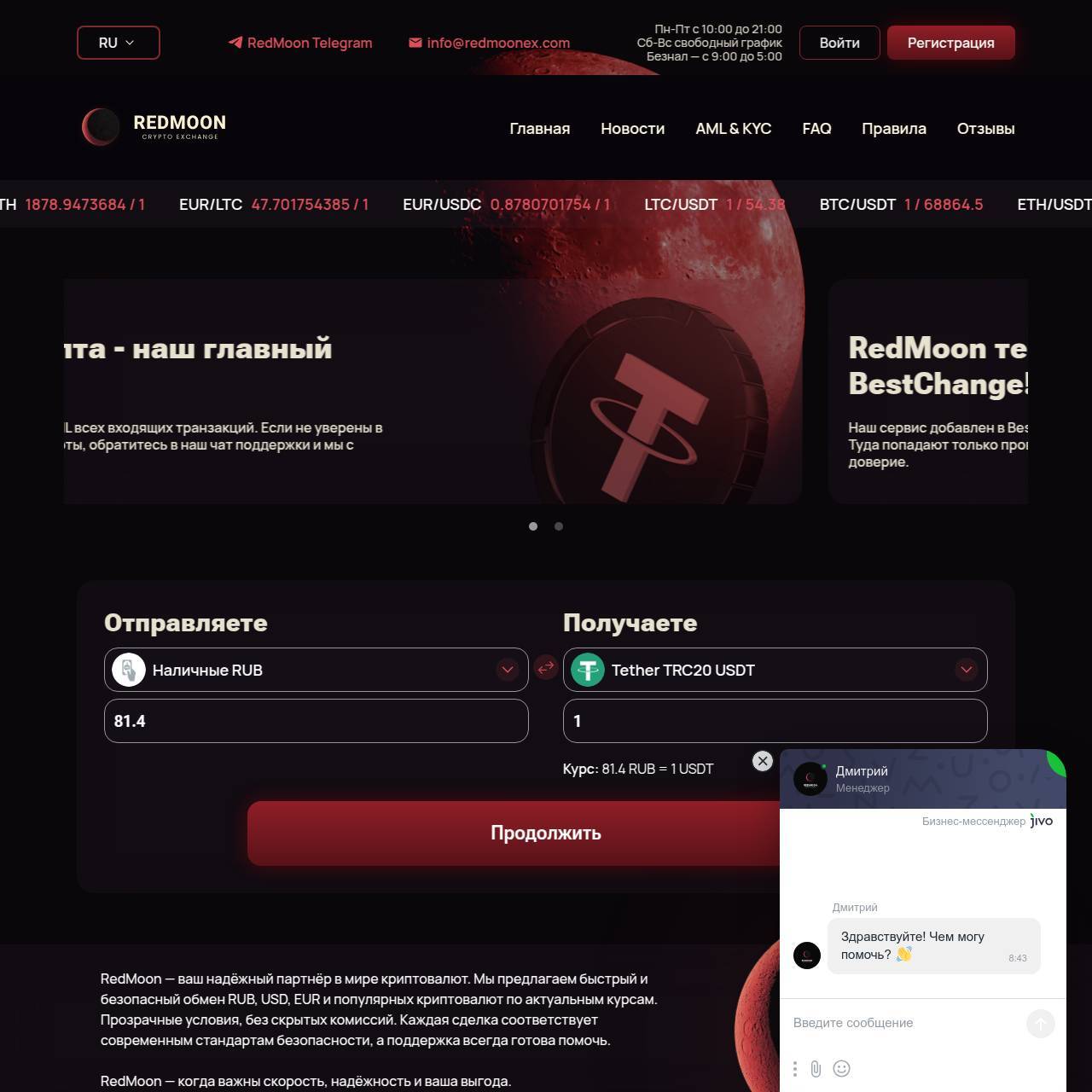 RedMoon — ваш надёжный партнёр в мире криптовалют. Мы предлагаем быстрый и безопасный обмен RUB, USD, EUR и популярных криптовалют по актуальным курсам. Прозрачные условия, без скрытых комиссий. Каждая сделка соответствует современным стандартам безопасности, а поддержка всегда готова помочь.