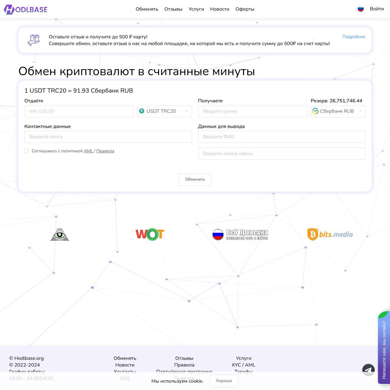 HodlBase - мы предоставляем как онлайн, так и оффлайн обмен криптовалюты.