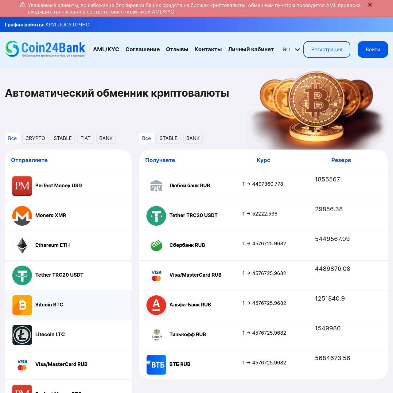 Coin24Bank - это инновационный онлайн-обменник криптовалют, который предоставляет своим пользователям быстрый и надежный доступ к обмену различных криптовалют.