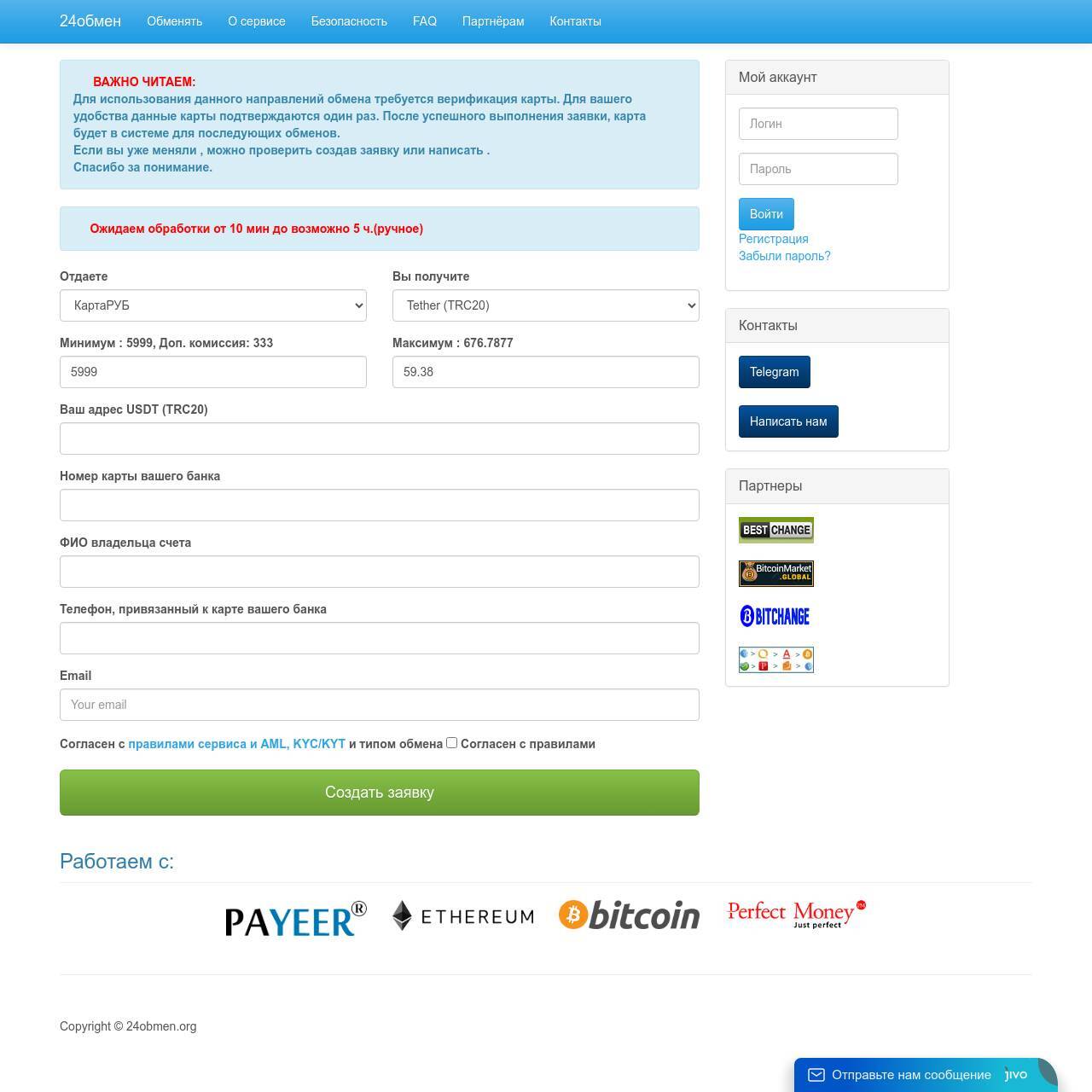 Сервис 24обмен осуществляет автоматический и ручной обмен 24 часа в сутки без перерывов, выходных и праздничных дней. Мы работаем с 2013г выполняем обмены качественно и профессионально. Надеемся вам понравится у нас. С уважением к Вам 24обмен