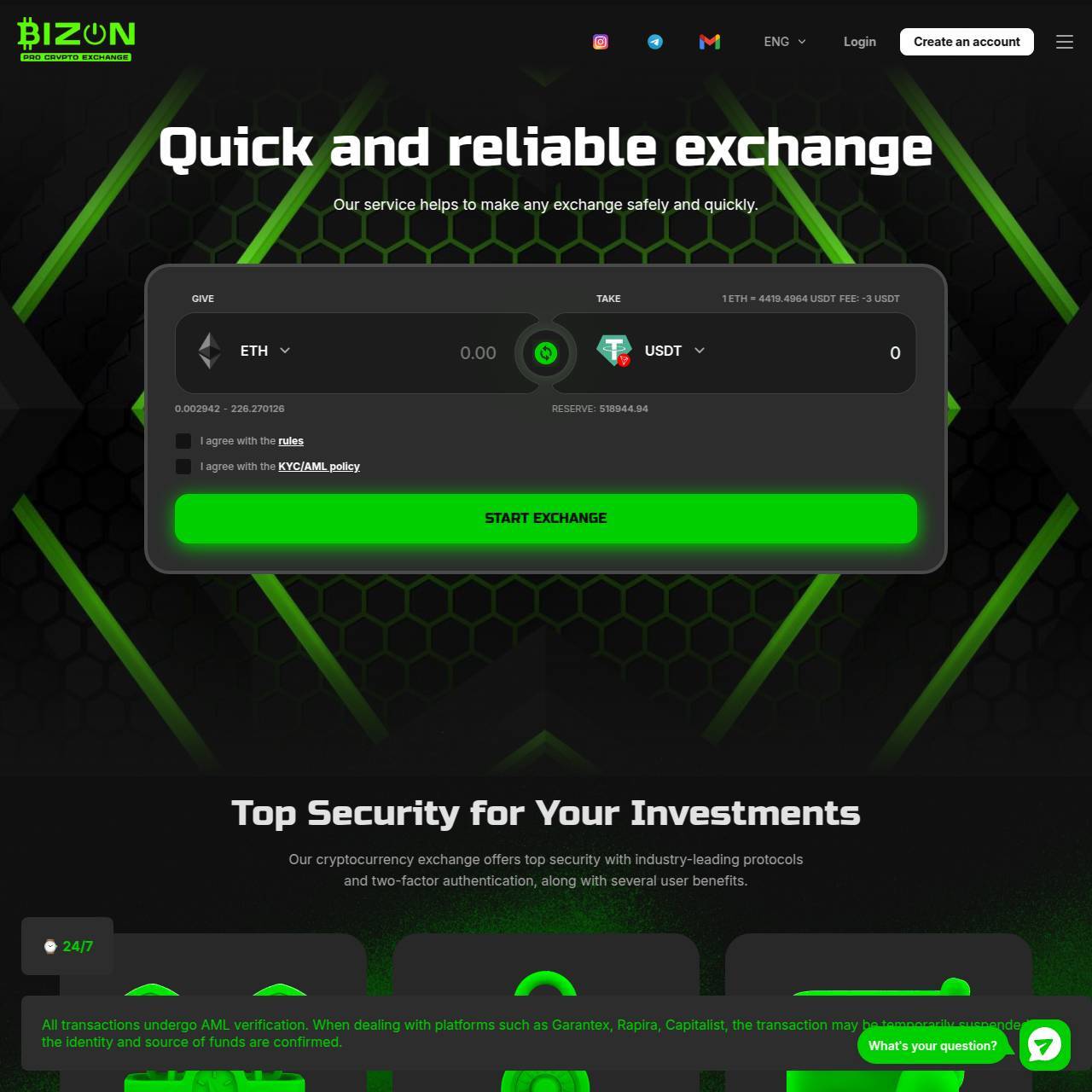 Рады представить Вам автоматический обменный пункт.Bizon Exchange - это онлайн-платформа для обмена криптовалют, которая предоставляет быстрый, удобный и безопасный способ для пользователей осуществлять обмен цифровых валют. Сервис поддерживает различные криптовалюты и фиатные валюты, предлагая конкурентные курсы и минимальные комиссии. Кроме этого, Bizon Exchange обеспечивает высокий уровень безопасности транзакций и пользовательских данных. Платформа ориентирована на простоту использования, что делает ее доступной как для новичков, так и для опытных криптовалютных трейдеров.