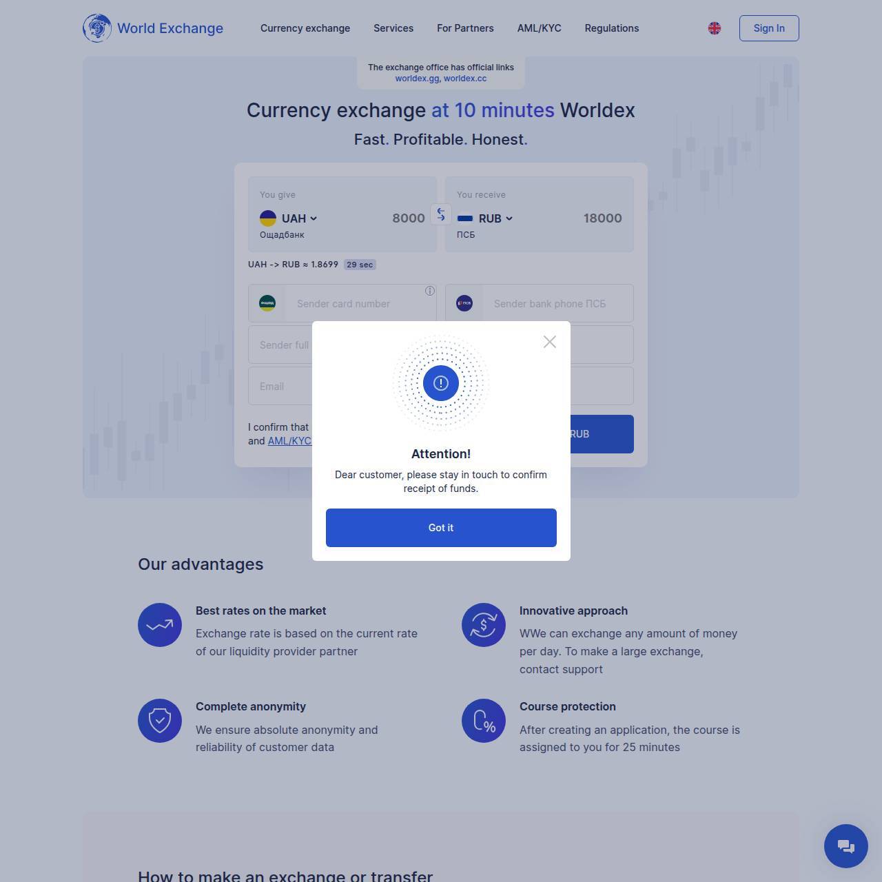 Впервые пользовалась обменником. Меняла грн. на руб. Очень переживала, но всё прошло отлично. Обмен совершился за 45 минут. Поддержка отвечает сразу же на все вопросы, молодцы. Рекомендую к обмену этот обменник!