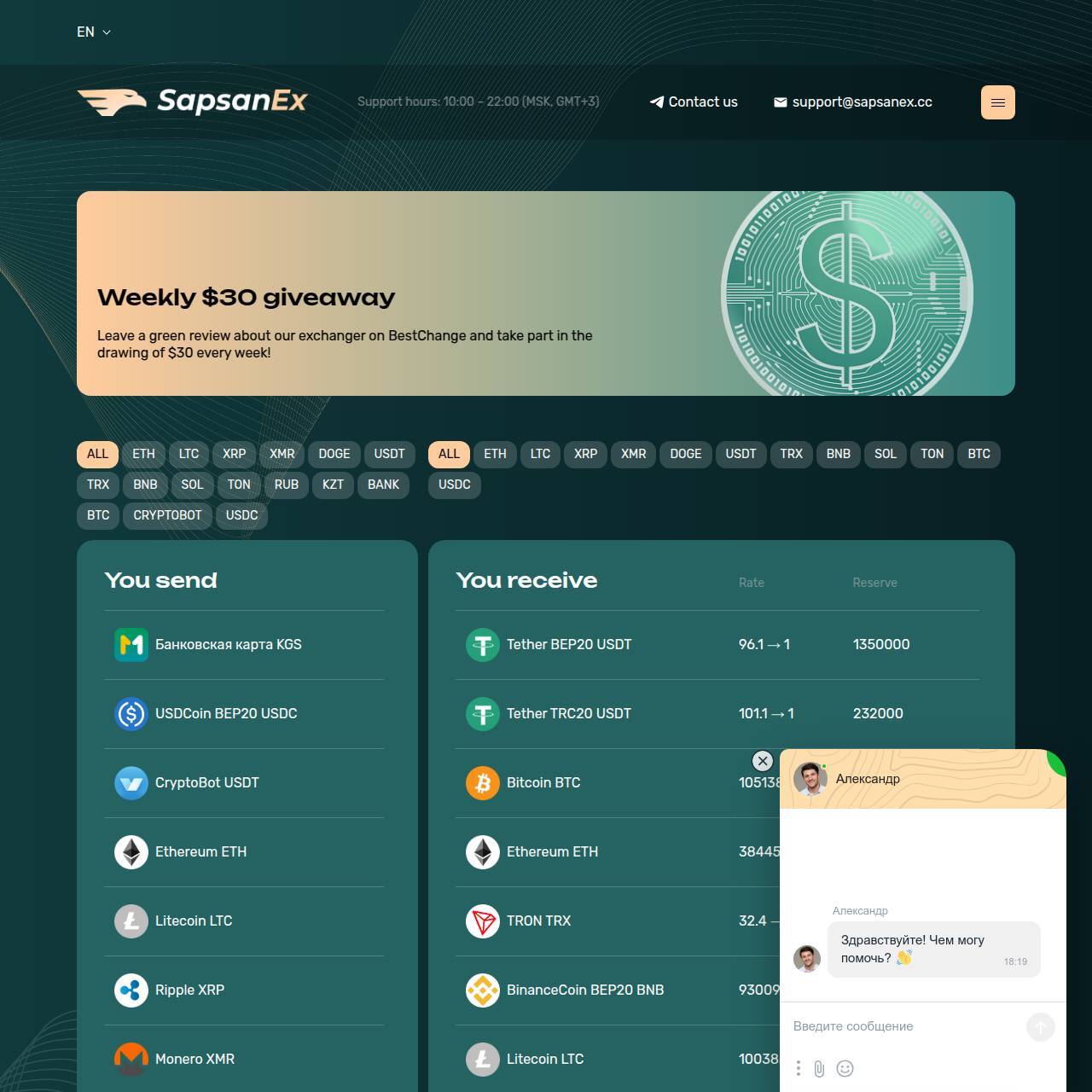 SapsanEX.cc – это инновационный онлайн-сервис, созданный для того, чтобы сделать процесс конвертации криптовалют и других электронных средств максимально простым и удобным для пользователей.
