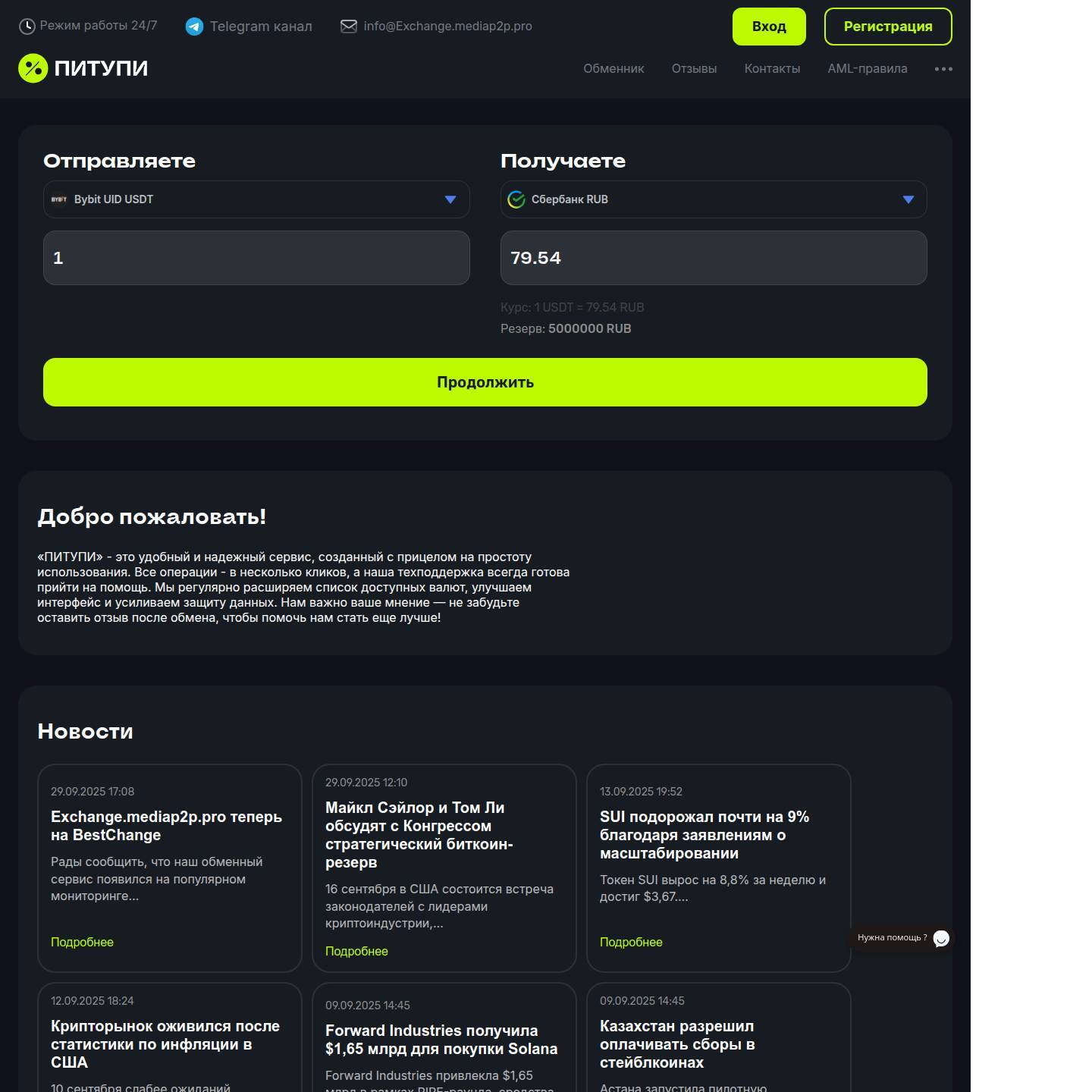 «ПИТУПИ» - это удобный и надежный сервис, созданный с прицелом на простоту использования. Все операции - в несколько кликов, а наша техподдержка всегда готова прийти на помощь. Мы регулярно расширяем список доступных валют, улучшаем интерфейс и усиливаем защиту данных. Нам важно ваше мнение — не забудьте оставить отзыв после обмена, чтобы помочь нам стать еще лучше!