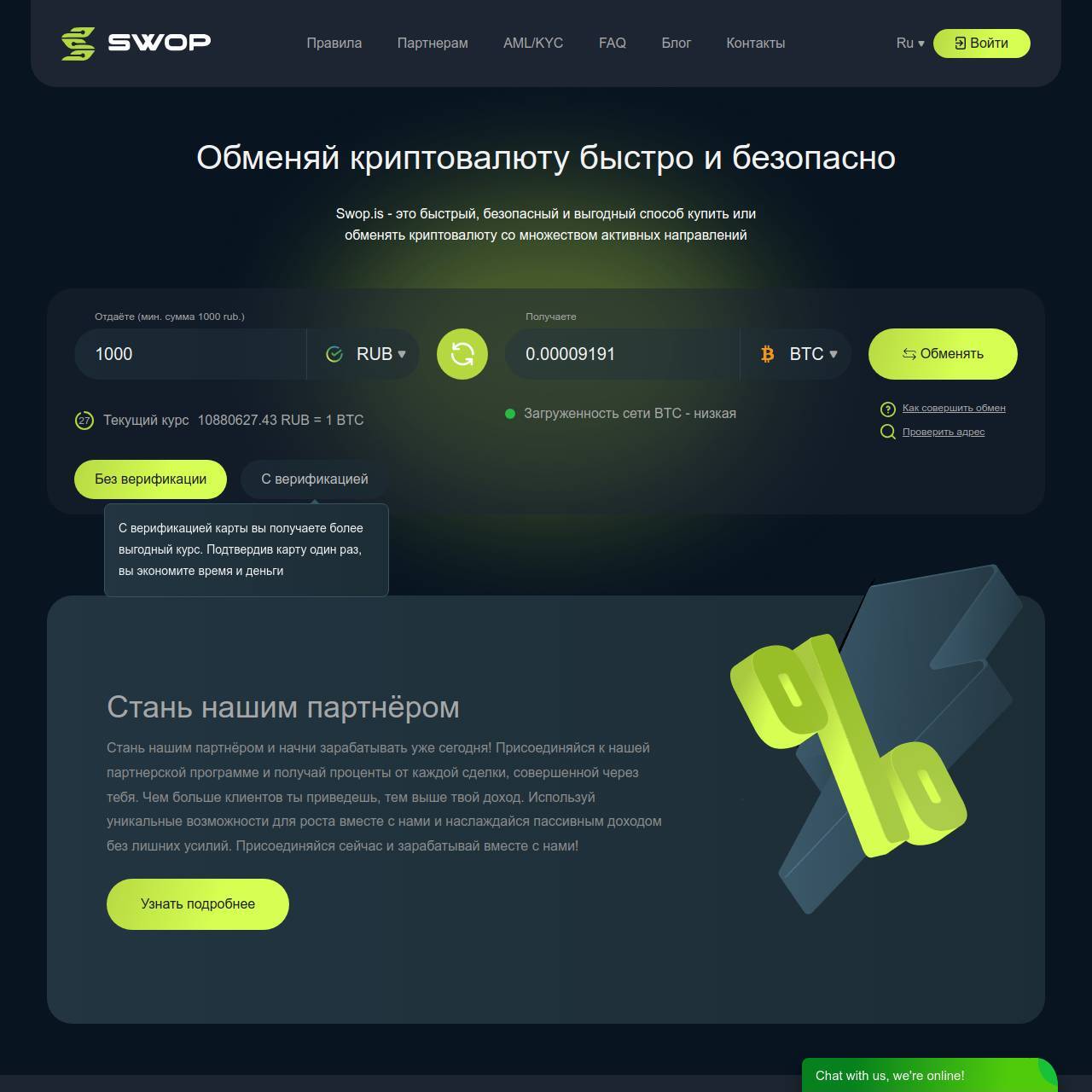 Swop.is - это быстрый, безопасный и выгодный способ купить или обменять криптовалюту со множеством активных направлений