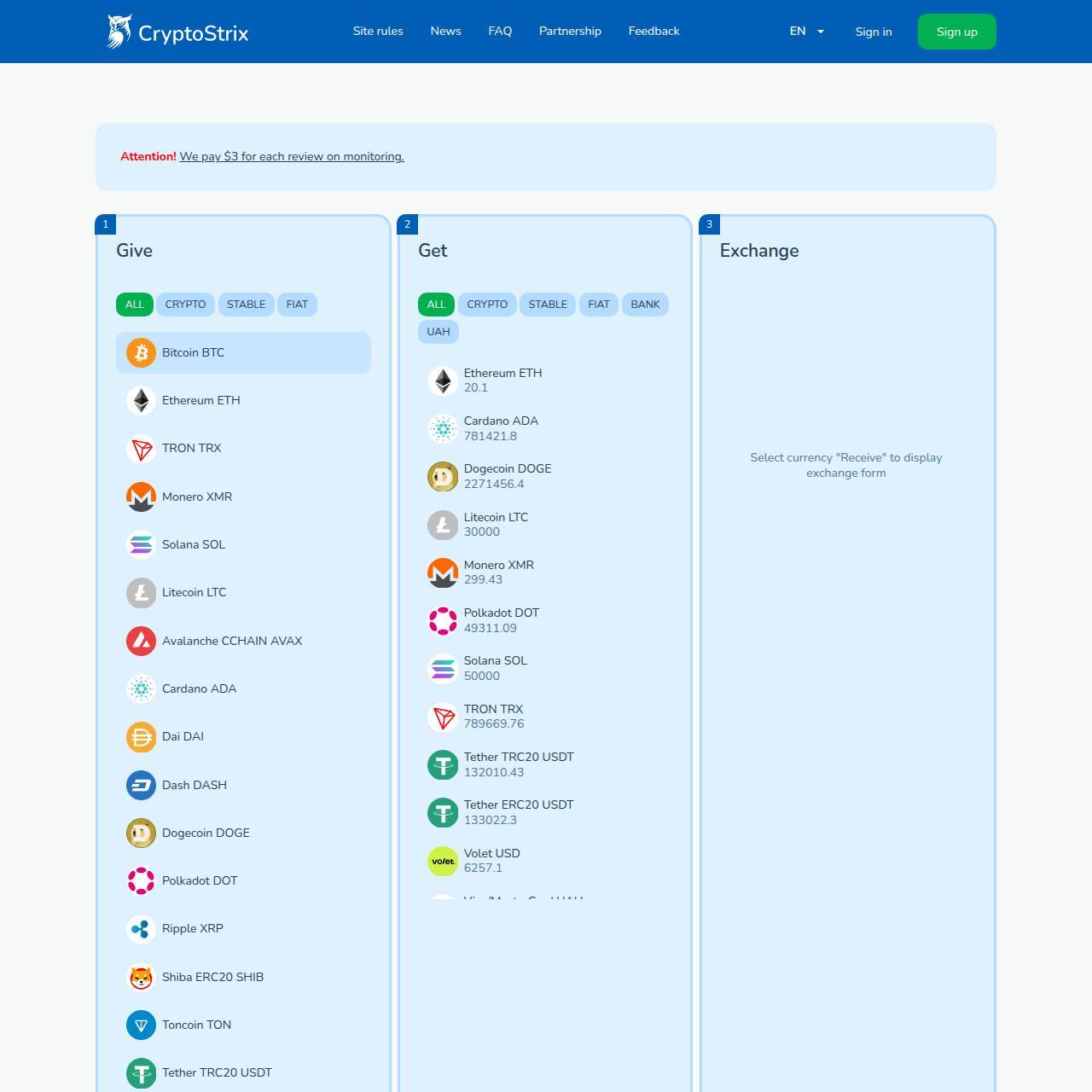 CryptoStrix – это новый онлайн сервис для тех, кто ищет место, где можно быстро, выгодно, без рисков обменять свою криптовалюту на другие токены и прочие виды электронных валют. Обмениваем Bitcoin, Ethereum, Tether, Tron, Solana, Monero, Dogecoin и другие монеты по максимально выгодным курсам. Обмен происходит в автоматическом режиме в любое время суток.