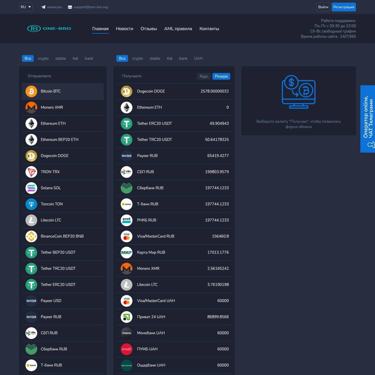 Пункт обмена электронных валют one-bro.org– система, созданная на базе современного программного обеспечения и содержащая весь набор необходимых функций для удобной и безопасной конвертации наиболее распространенных видов электронных денег
