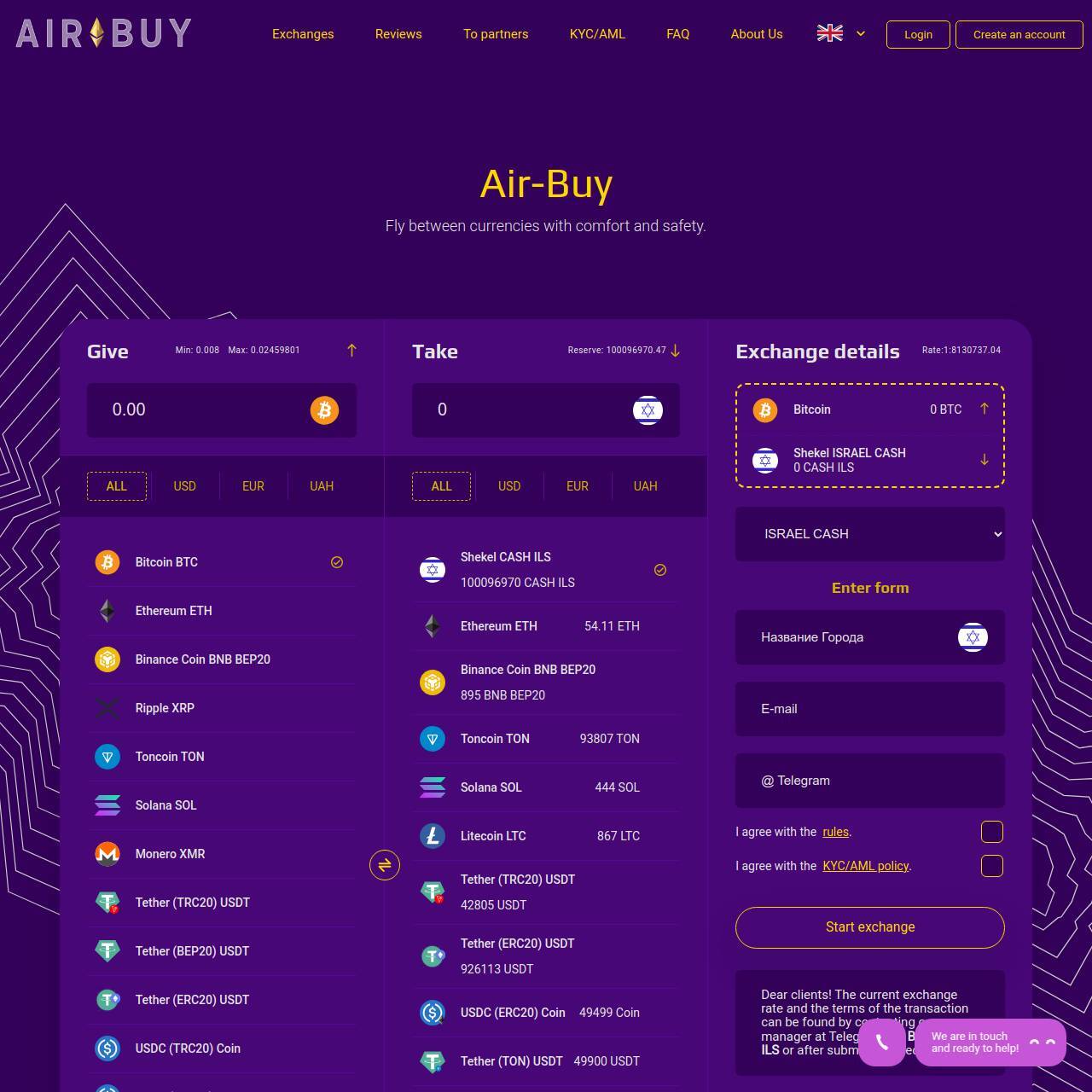 Air-Buy.EXchange это надежный сервис обмена электронных денег, предоставляющий удобные и безопасные решения для пользователей по всему миру. Мы работаем с популярными криптовалютами и электронными платежными системами, обеспечивая быстрые и безопасные транзакции.