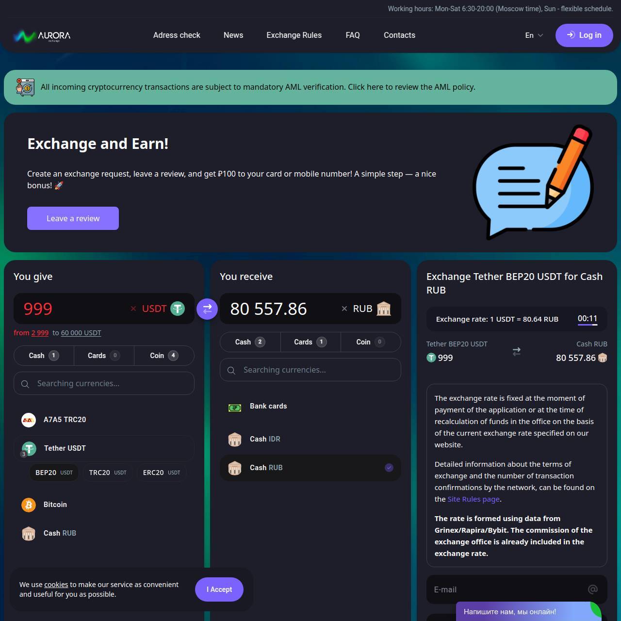 Aurora-Exchange — надежный обменный сервис с выгодными курсами и высоким уровнем безопасности.