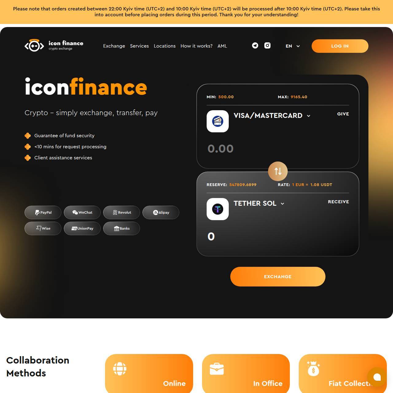 Icon finance это криптовалютный обменник с дополнительными услугами по оплате товаров и услуг, а также переводу средств по всему миру, включая Украину, Европу, Азию, СНГ, Африку, Латинскую Америку и США.