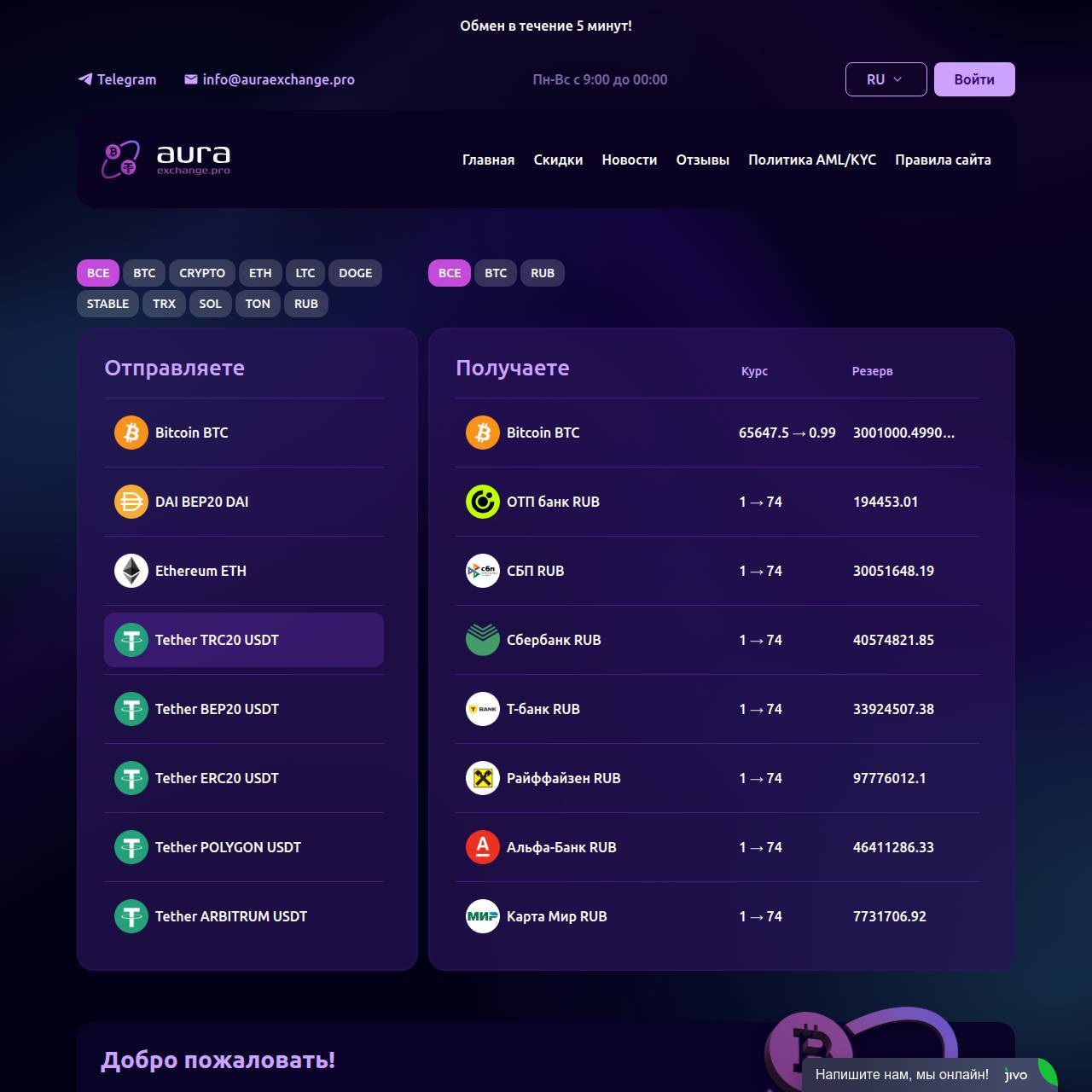 Онлайн чат на сайте AuraExchange.pro