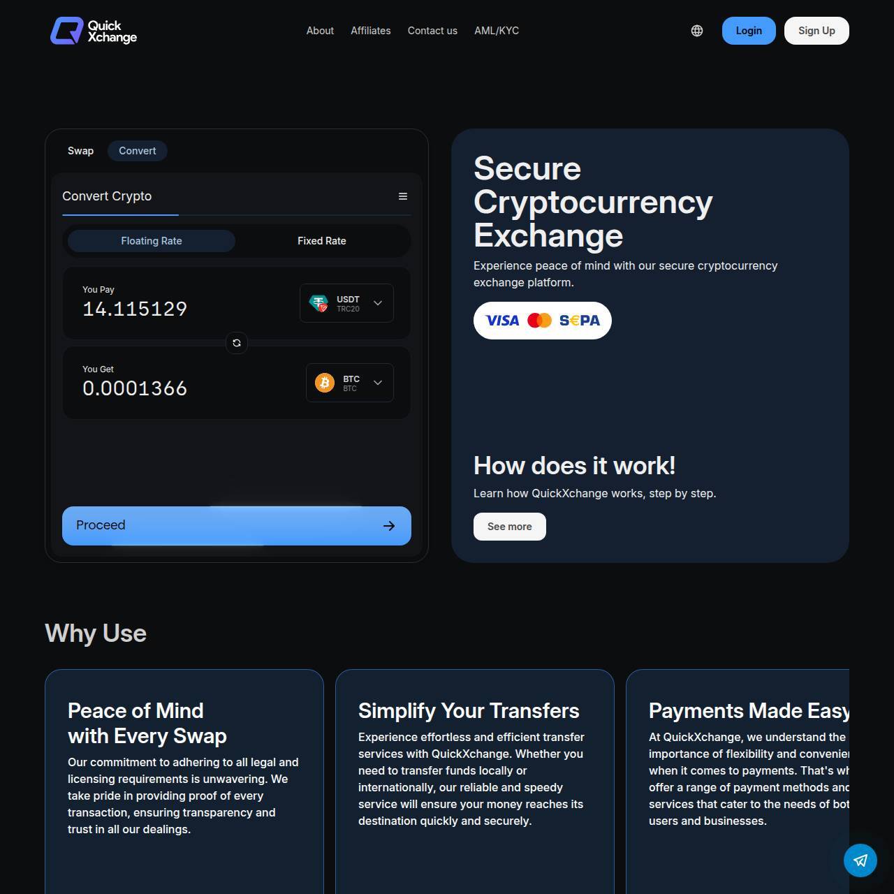 Оцените бесшовные конвертации криптовалюты в криптовалюту и фиатные валюты на нашей платформе. Мы стремимся ежедневно расширять наши предложения, добавляя новые валюты, монеты и токены для удовлетворения ваших растущих потребностей. По мере нашего роста мы будем использовать передовые технологии, такие как блокчейн и Web3, для предоставления инновационных услуг для продвинутого криптосообщества. Безопасность является нашим главным приоритетом. Наша некастодиальная платформа гарантирует, что вы сохраняете полный контроль над своими средствами, обеспечивая безопасный и эффективный процесс торговли.